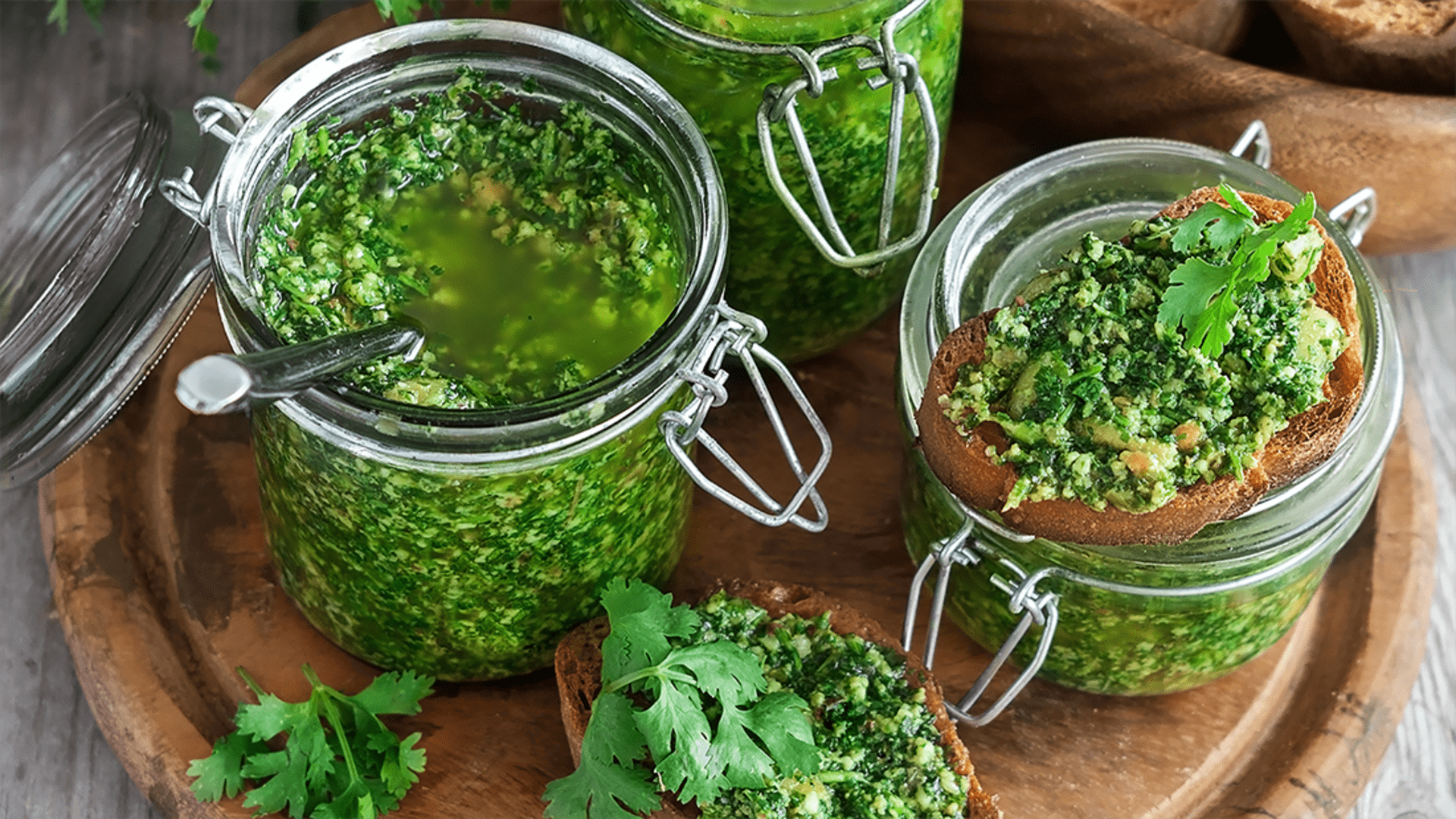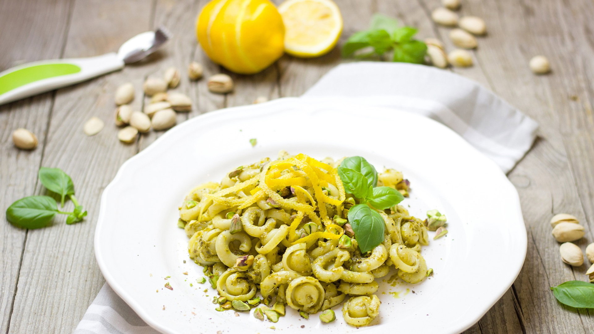 Das Basilikum und die Petersilie waschen und trocken schütteln. Die Pistazien schälen und mit dem Knoblauch klein hacken. Den Parmesan fein reiben. Nun alle Zutaten mit der Hälfte des Olivenöls in einen Mixer geben und pürieren (alternativ kann das natürlich mit einem Mörser gemacht werden). Anschließend das restliche Öl hinzugeben und unterrühren.