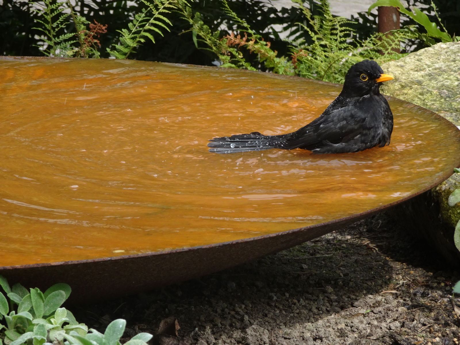 Ein Wasserspiel ist Blickfang und gut gemacht auch Wasserstelle für Vögel und Insekten
