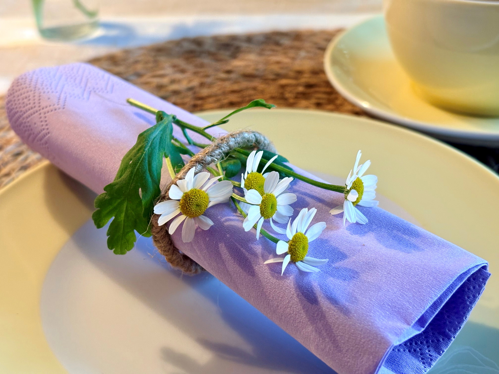 Stecke kleine Blümchen aus dem Garten oder dem Blumenladen in das gewickelte Juteband. So kannst du die Serviettenringe immer passend zum Anlass oder zur Jahreszeit dekorieren.