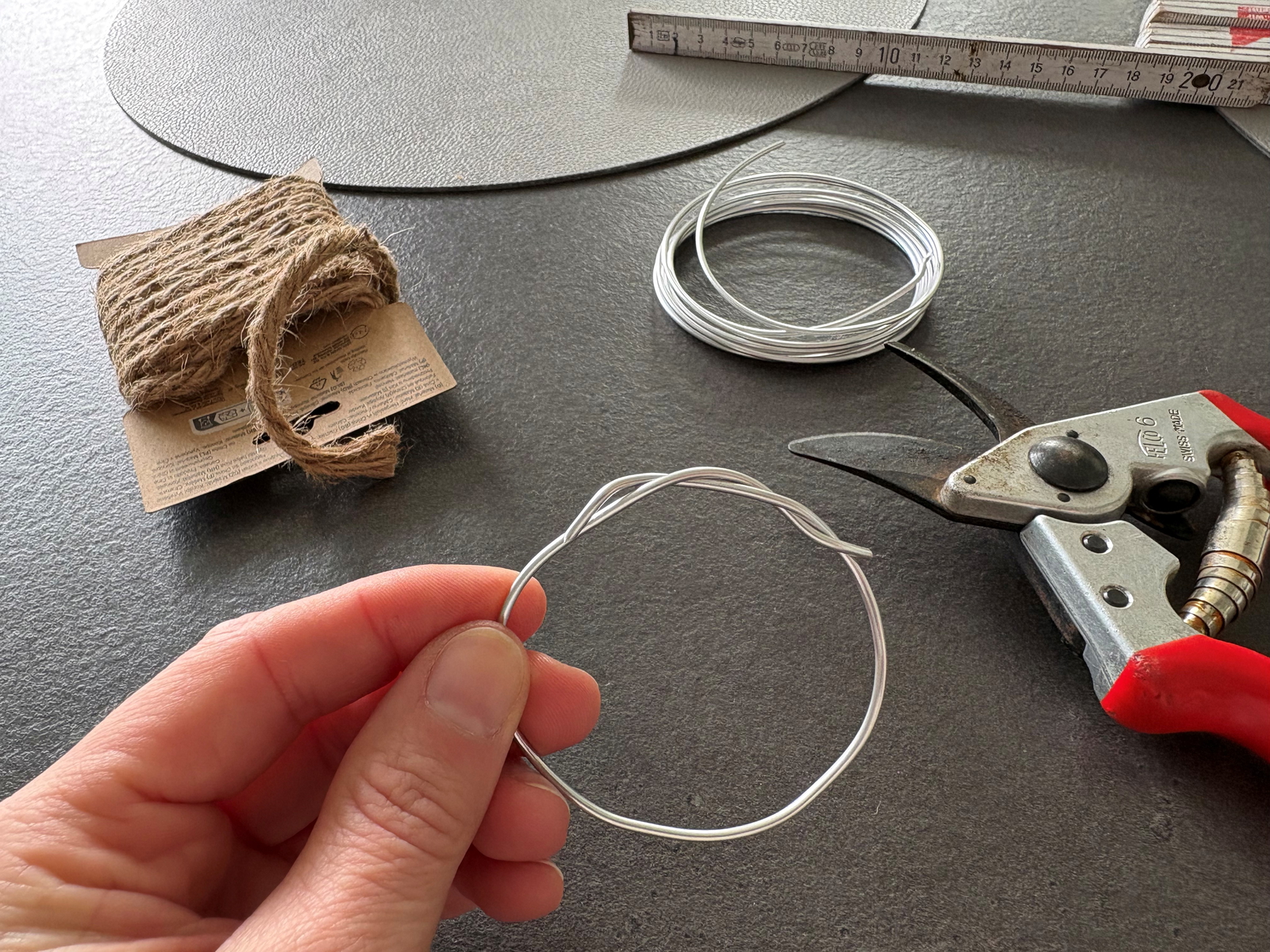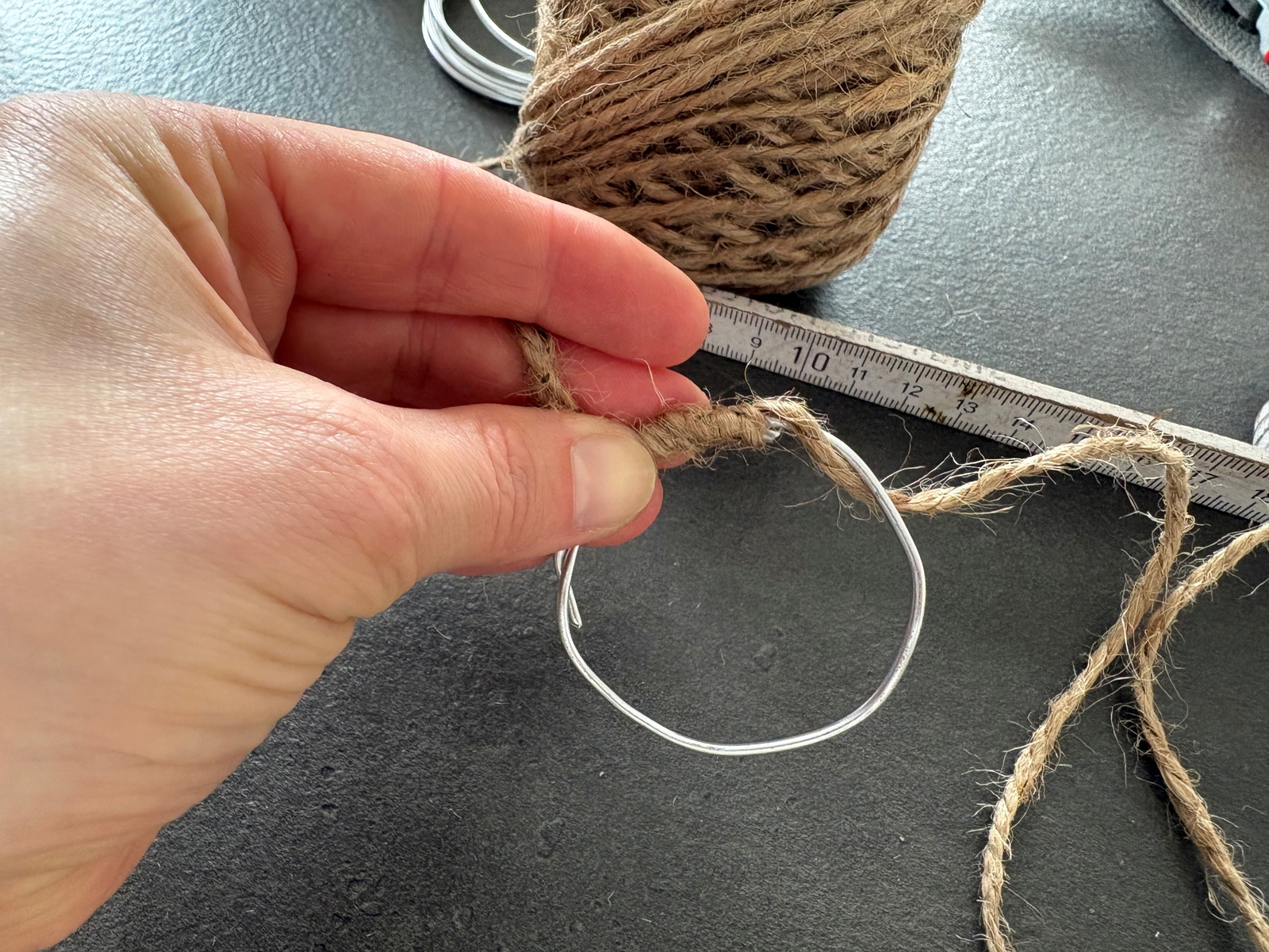 Schneide etwa 1 Meter Juteband ab. Wickle das Band dicht und gleichmäßig um den Drahtkreis, bis der gesamte Ring rundherum bedeckt ist.