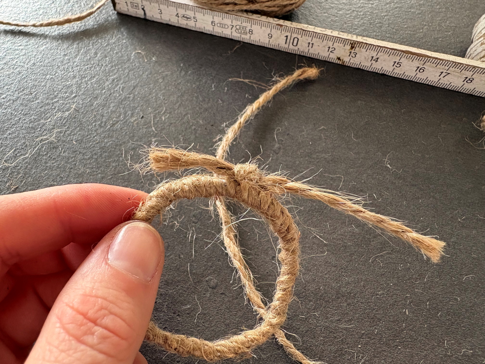 Verknote das Juteband am Ende fest und schneide die Enden ab. Tipp: lege die verknotete Stelle später nach unten.