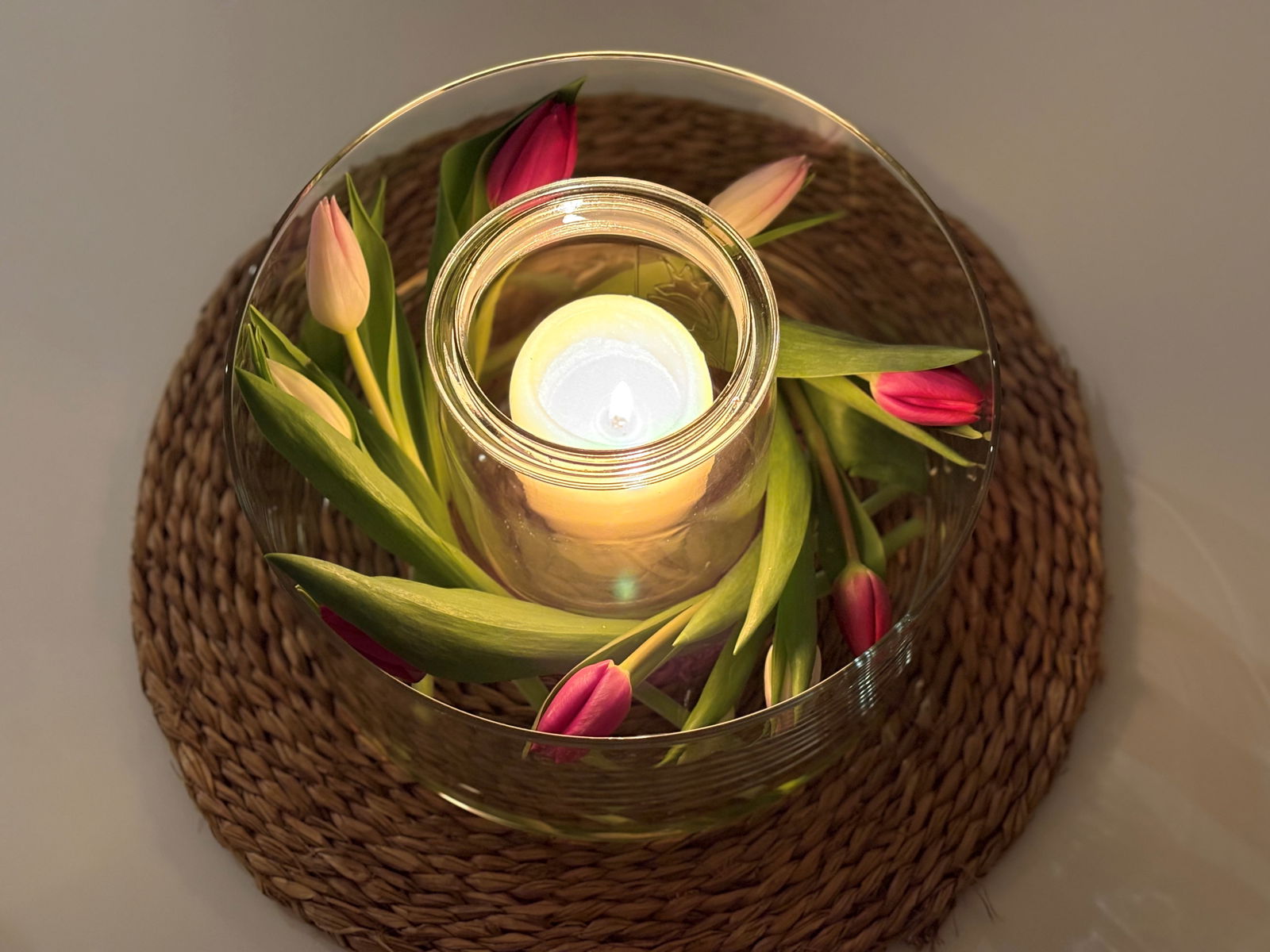 Tulpen läuten den Frühling ein und bringen mit ihren leuchtenden Farben Frische und Lebensfreude in jedes Zuhause. Besonders schön wirken sie, wenn sie stilvoll arrangiert werden – zum Beispiel in einer flachen Glasvase, kombiniert mit einem Windlicht. Das sanfte Kerzenlicht setzt die Blüten gekonnt in Szene und sorgt für eine warme, gemütliche Atmosphäre. Ob als Hingucker auf dem Esstisch oder als frühlingshaftes Arrangement im Wohnzimmer: Dieses DIY verwandelt einfache Tulpen und eine Glasvase in ein bezauberndes Deko-Highlight.