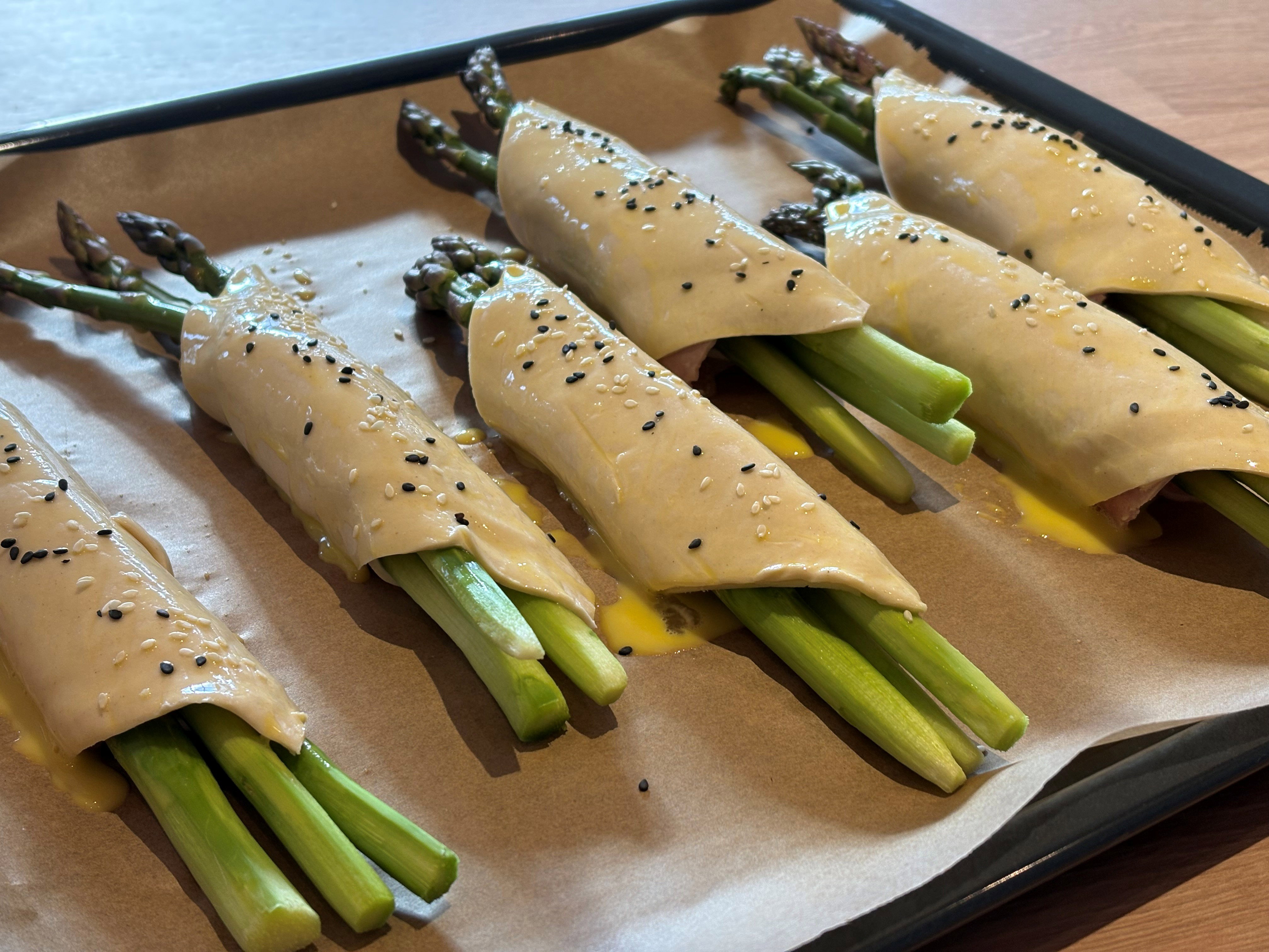 Nun jeweils eine Scheibe Käse und eine Scheibe Kochschinken auf den Blätterteig legen. Jedes Teigquadrat mit drei Spargelhälften belegen und anschließend alles einrollen. Die Taschen mit der Öffnung nach unten auf ein mit Backpapier ausgelegtes Backblech legen.