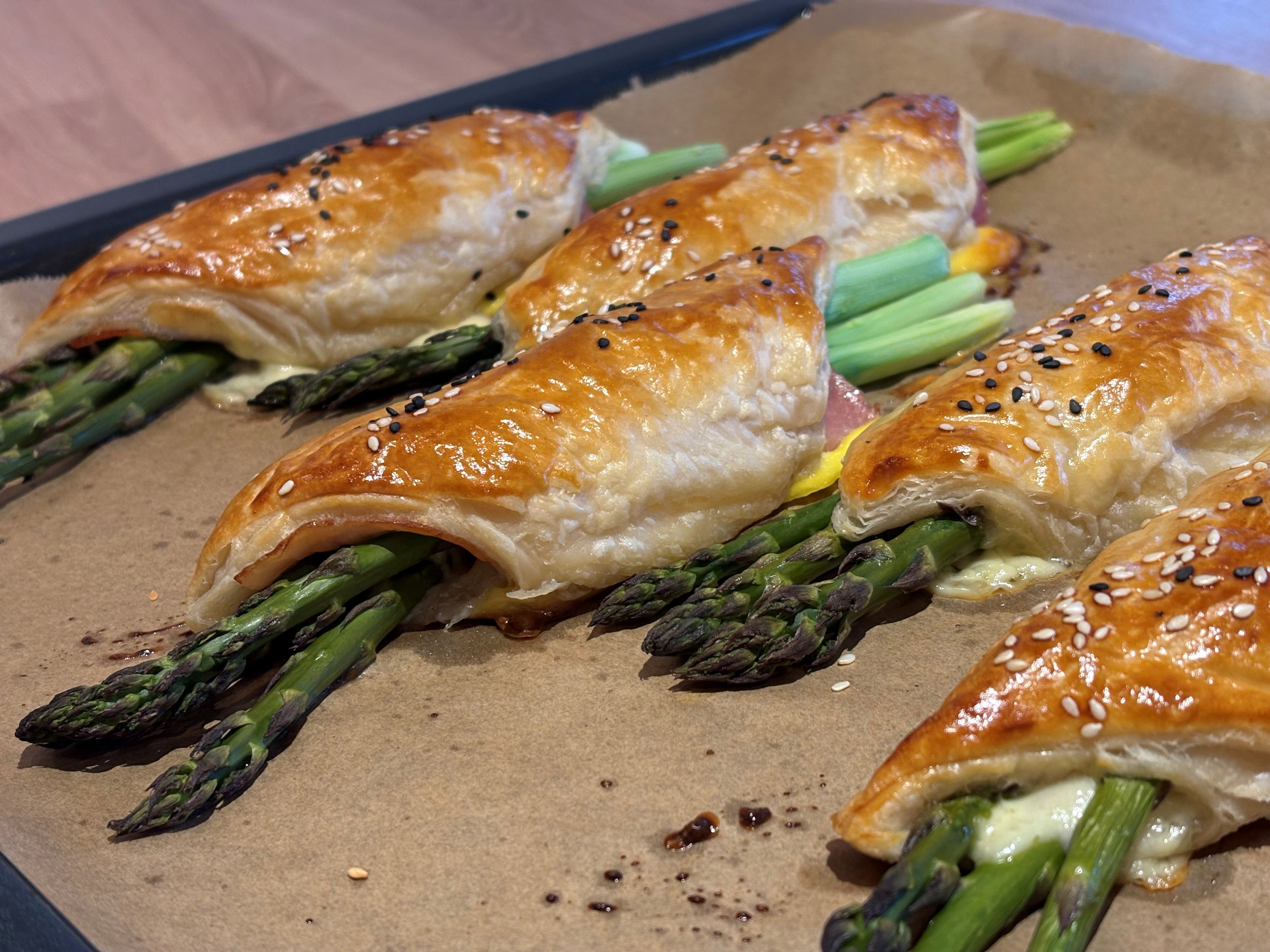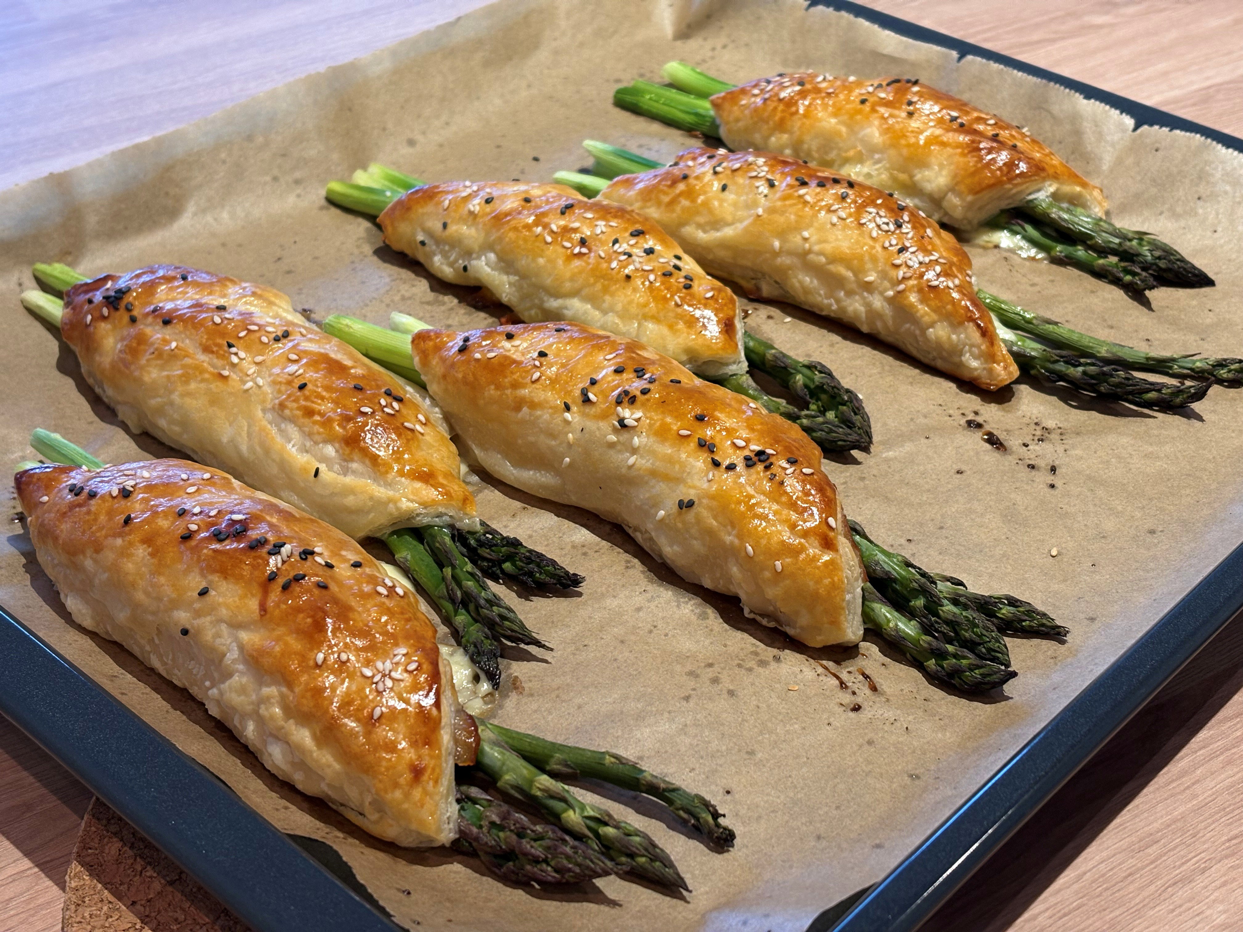 Die Spargel-Blätterteigtaschen für 15–20 Minuten goldbraun backen. Wer mag, kann die leckeren Taschen mit Sauce Hollandaise genießen.